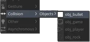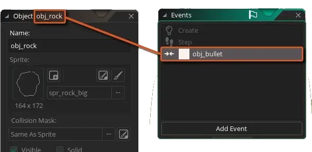 Öffne obj_rock, füge ein Collision-Event mit obj_bullet