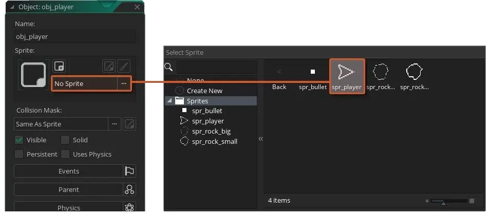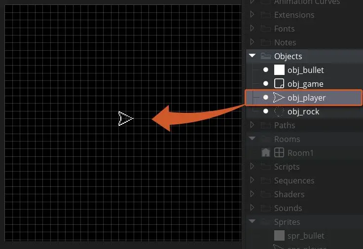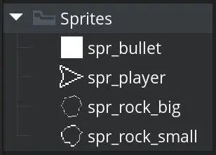 spr_player– dein Raumschiffspr_bullet– dein Laserschussspr_rock_big– großer Asteroidspr_rock_small– kleiner Asteroid