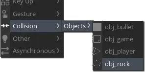 Öffne obj_player und füge ein Collision-Event mit obj_rock