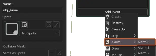 Öffne obj_game und füge ein Alarm 0-Event hinzu. Trag diesen Code ein: